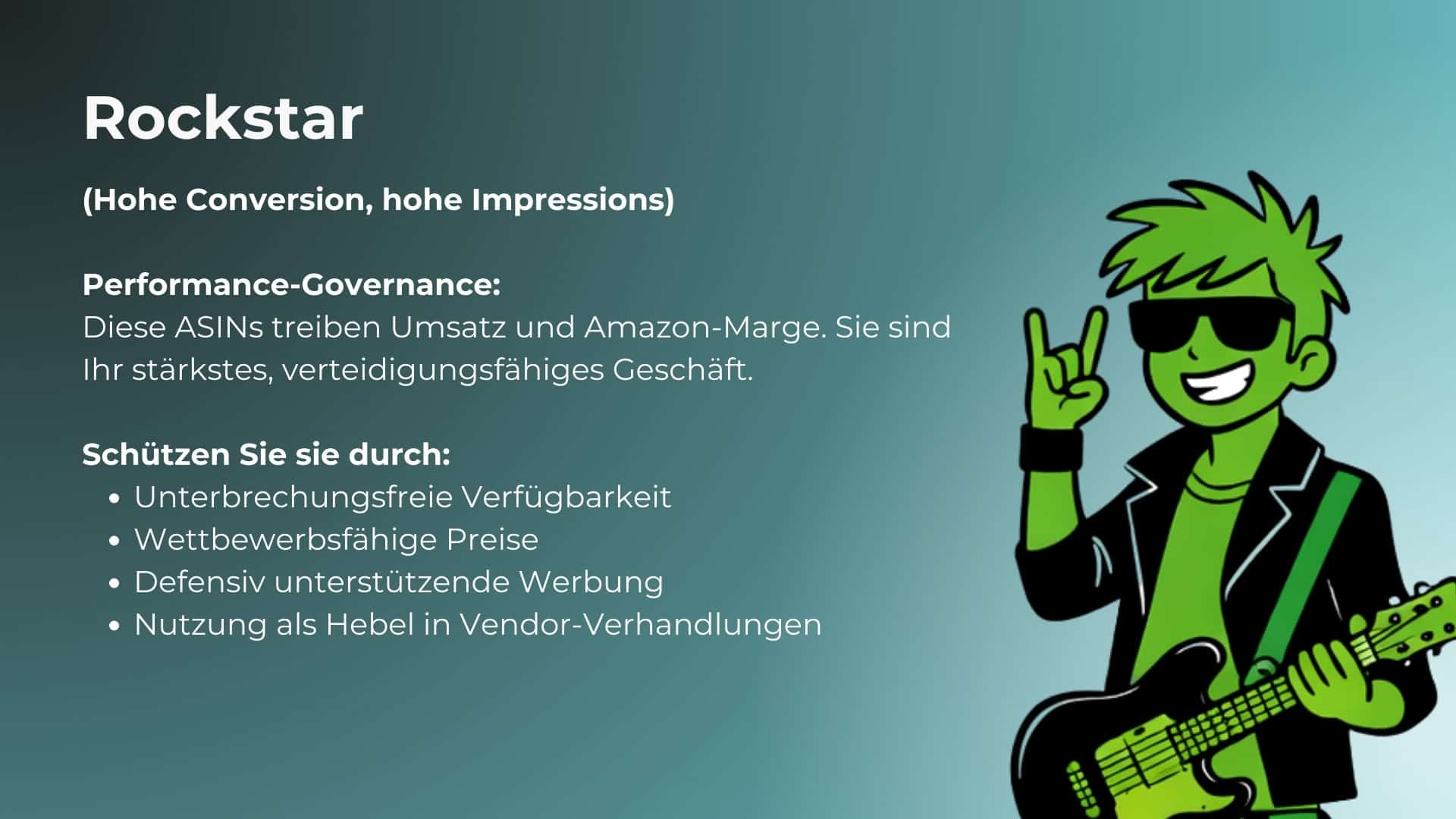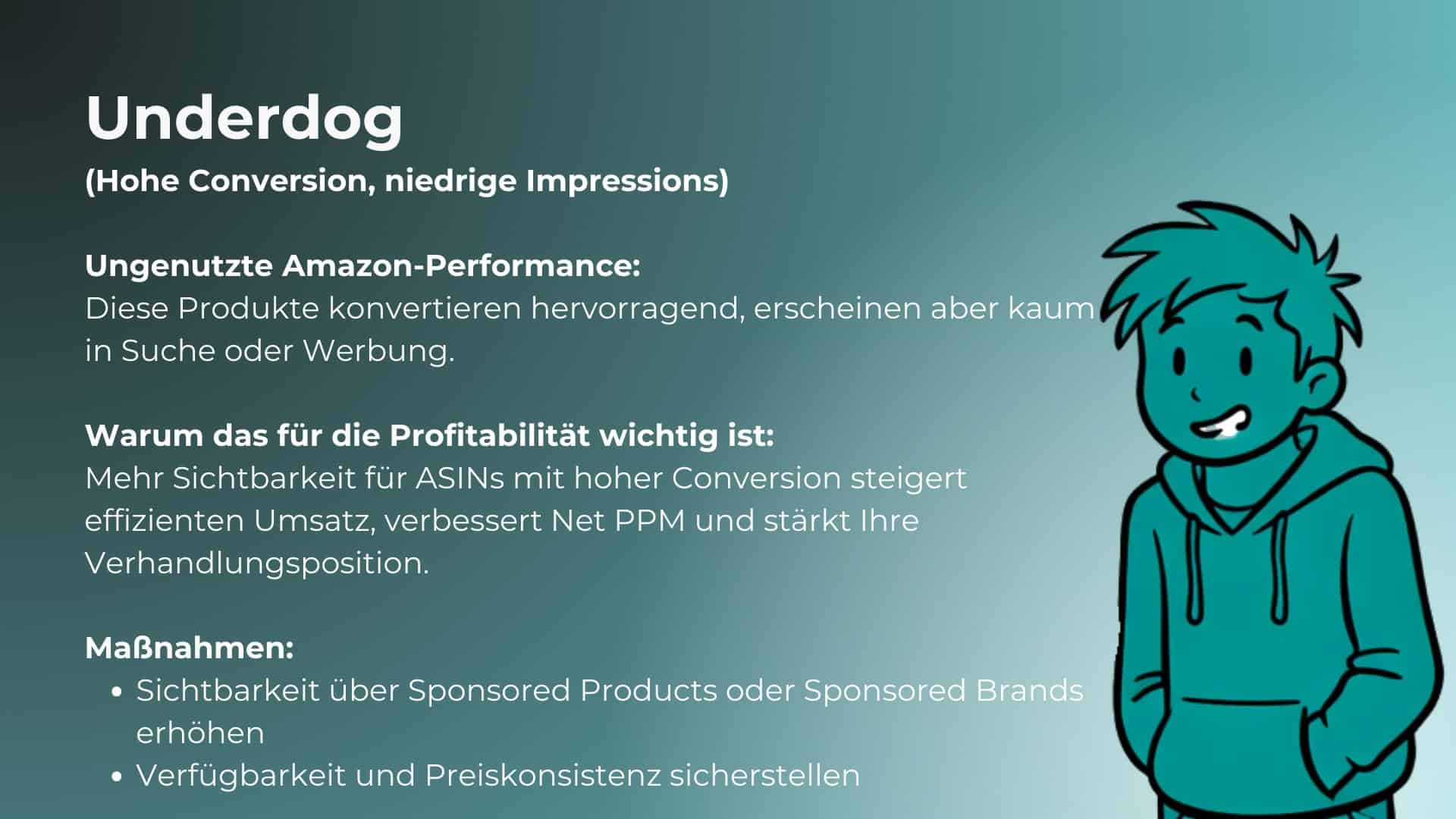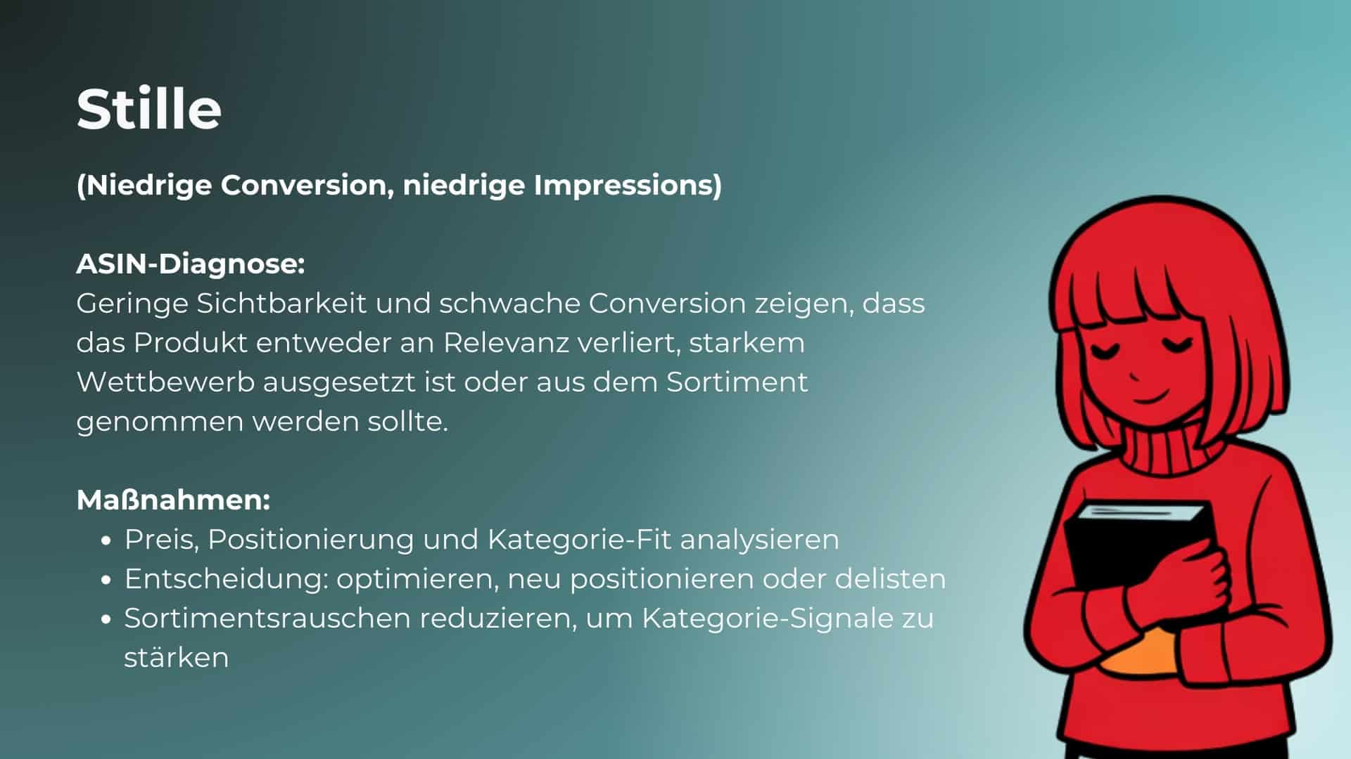 Wenn ASINs entlang von Conversion Rate (Qualität) und Impressions (Sichtbarkeit) gemappt werden, entstehen Muster, die zeigen, wie Amazon Ihre Produkte wahrnimmt – und wo Handlungsbedarf besteht.